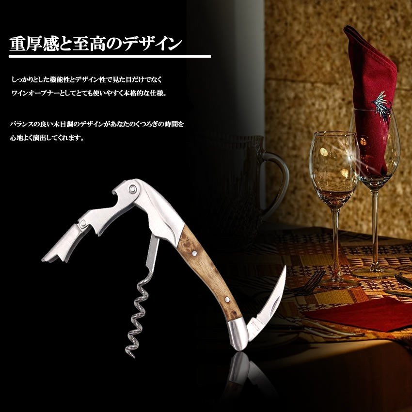 ステンレス ワインオープナー ナイフ コルク 栓抜き ボトル インテリア おしゃれ レトロ 木目 金属 重厚感 王冠 開栓 マルチ ツール tecc-wineopen03